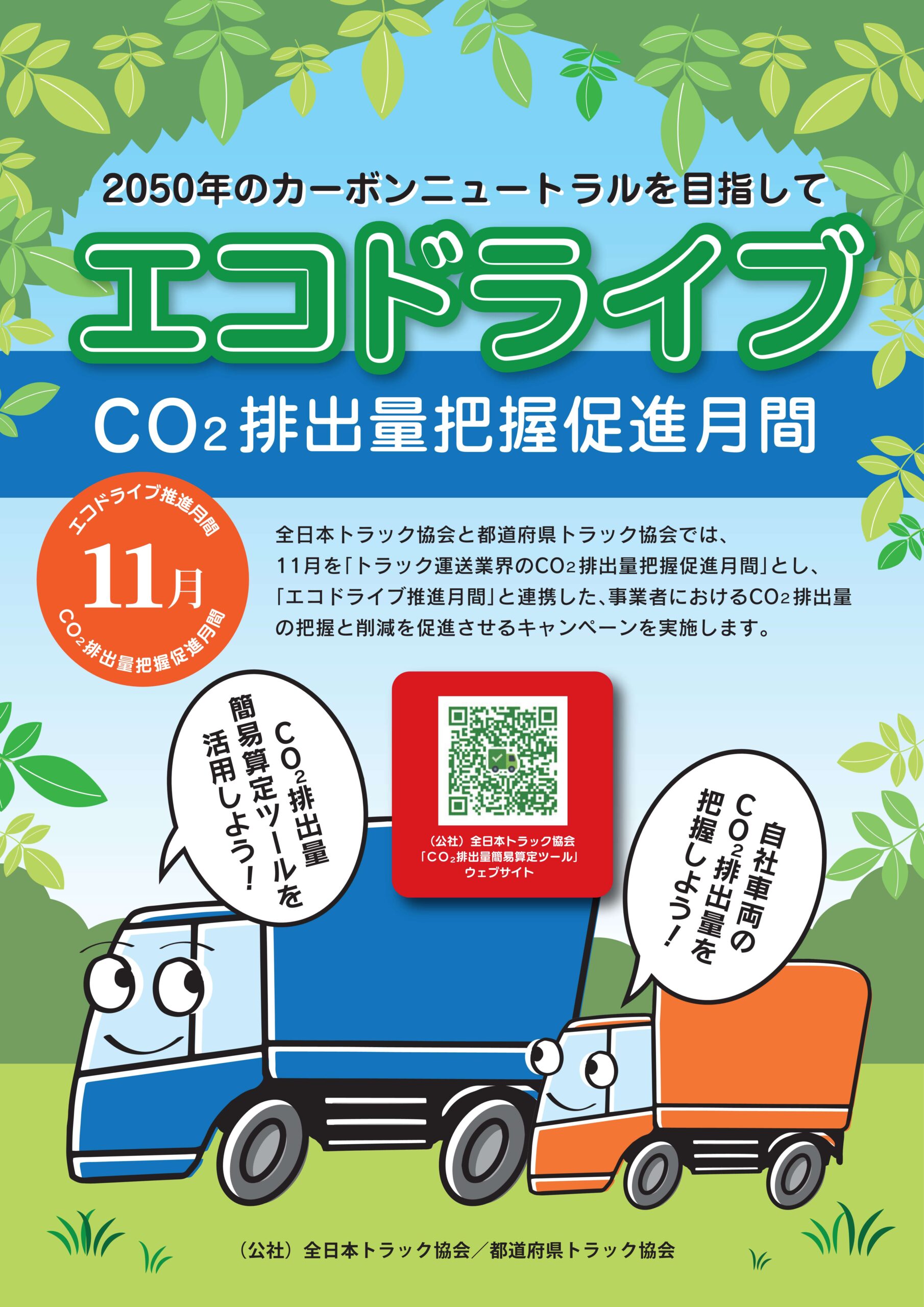 全日本トラック協会と都道府県トラック協会では、11月を「トラック運送業界のCO2排出量把握促進月間」とし、「エコドライブ推進月間」と連携した、事業者におけるCO2排出量の把握と削減を促進させるキャンペーンを実施します。