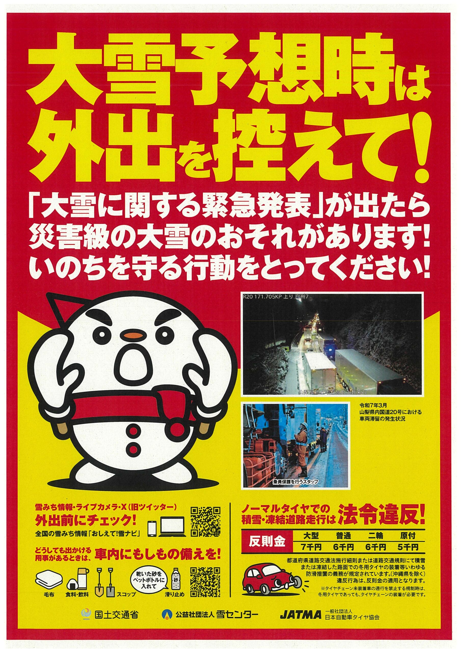 つきましては、短期間の集中的な大雪が予測される場合は、利用抑制や広域的な迂回にご理解・ご協力を頂くとともに、やむを得ず道路をご利用される場合は、冬期の安全な交通を確保する為にも、冬期における早期の冬用タイヤの装着、チェーン携行、砂及びスコップ等の装備など事前の対策をお願いする旨、国土交通省より要請がありましたのでお知らせいたします。
