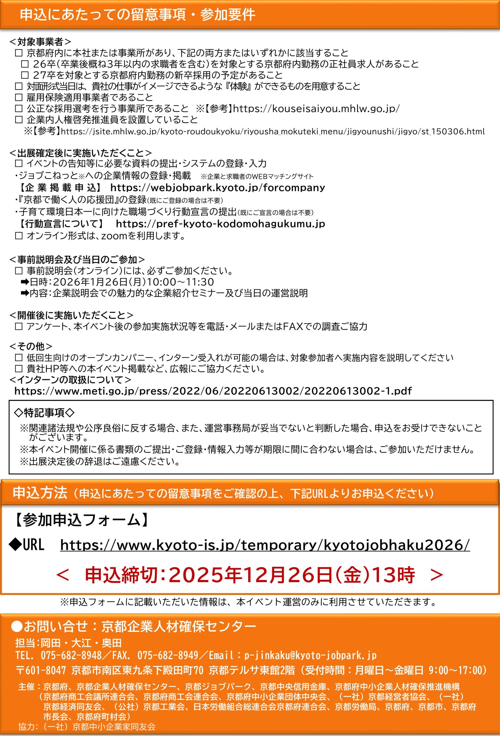 京都企業人材確保センターより、下記の通り「京都ジョブ博2026」参加企業募集のご案内がありました。
