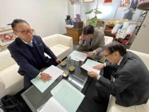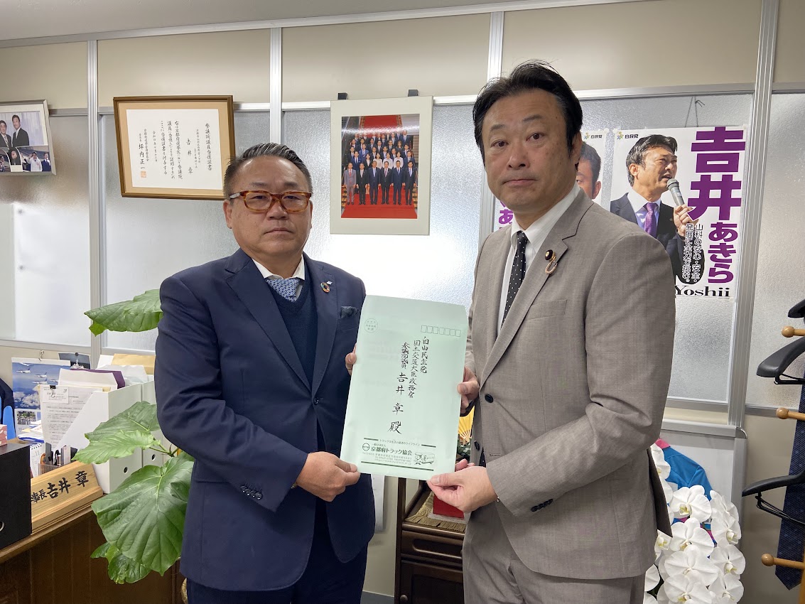 本日、平島会長、井尻専務、山田常務が参議院議員 𠮷井 章国土交通大臣政務官の京都事務所において標記の要望内容についてご説明を行い実現に向けた取組を要望いたしました。