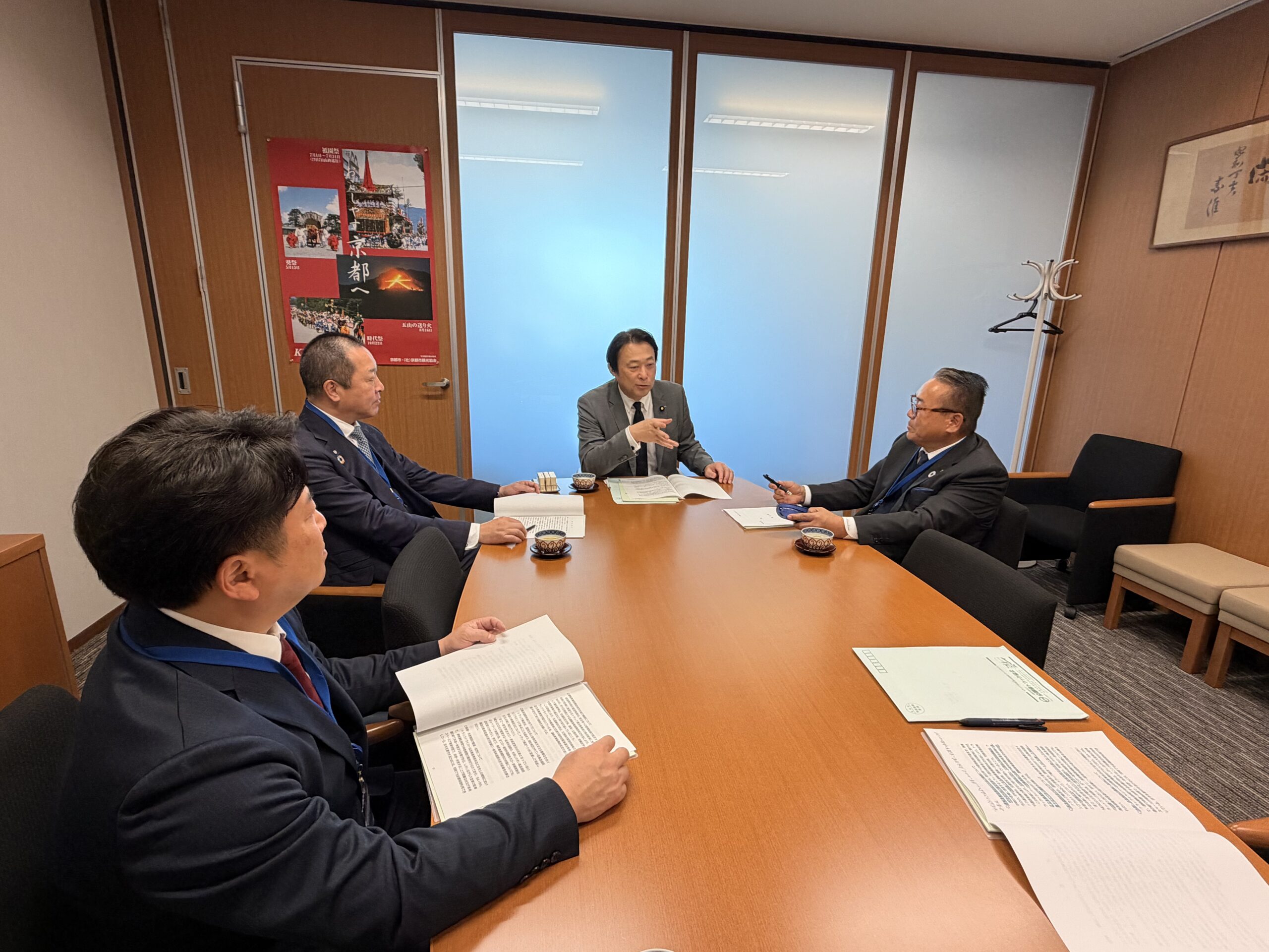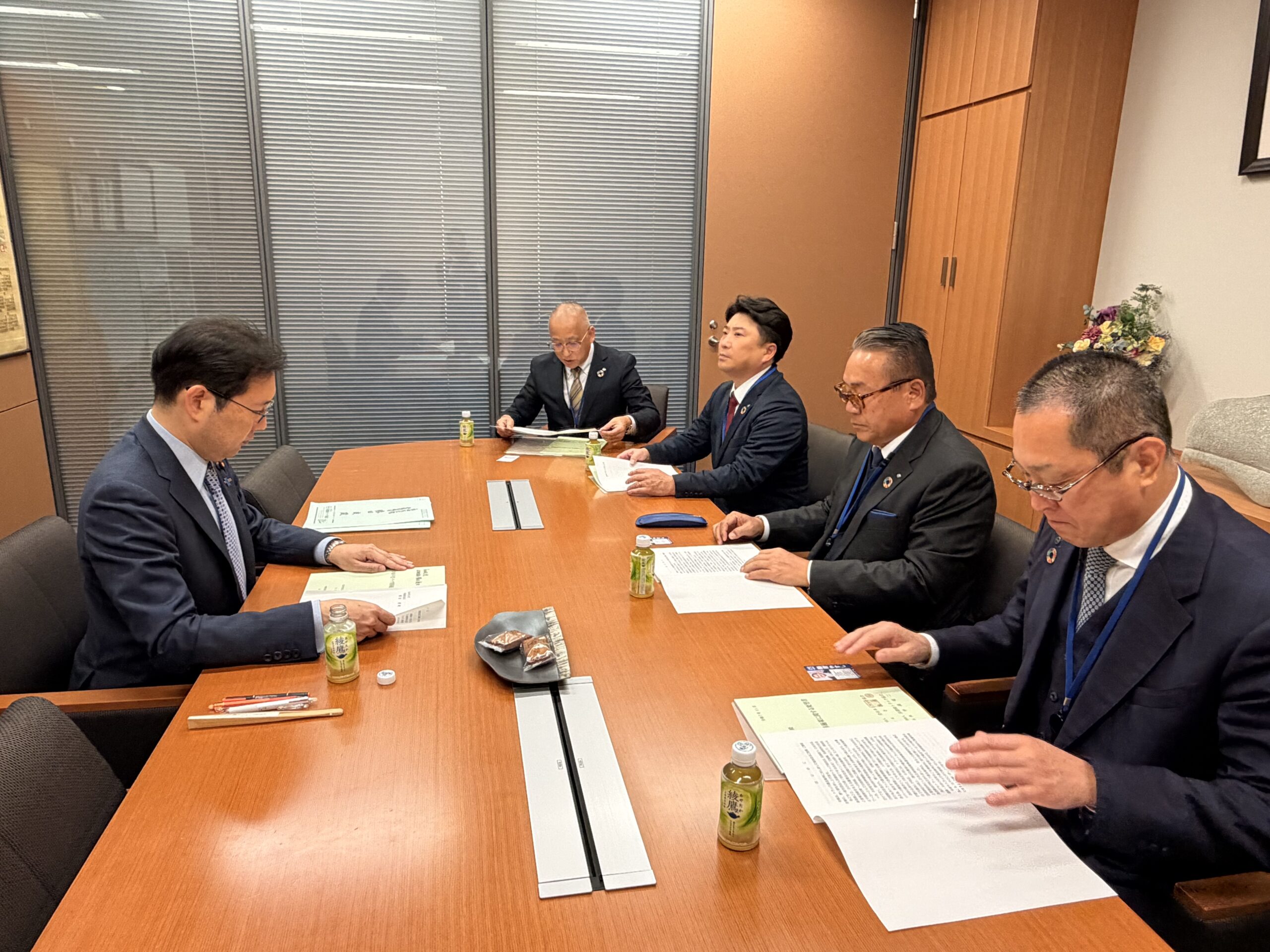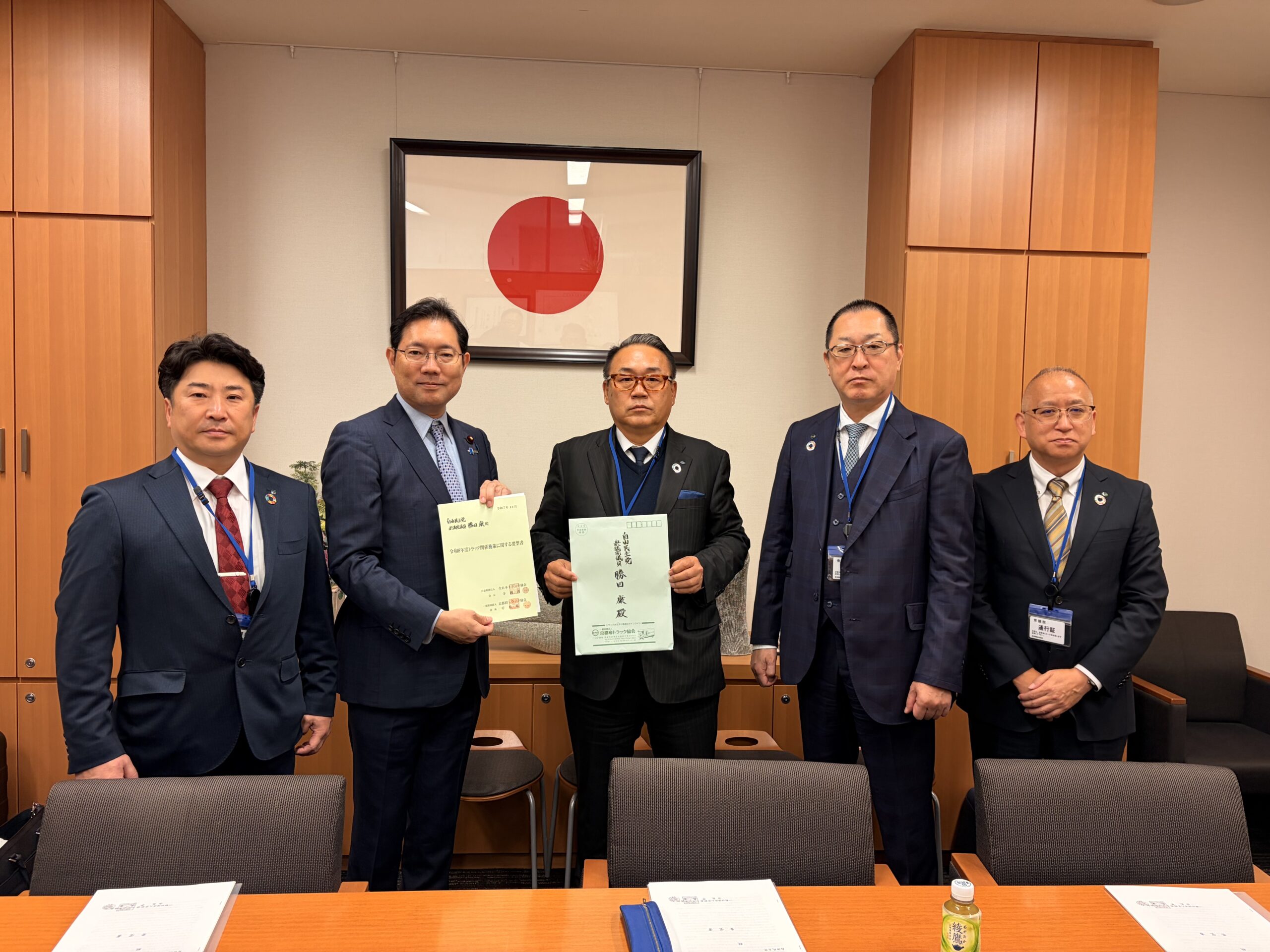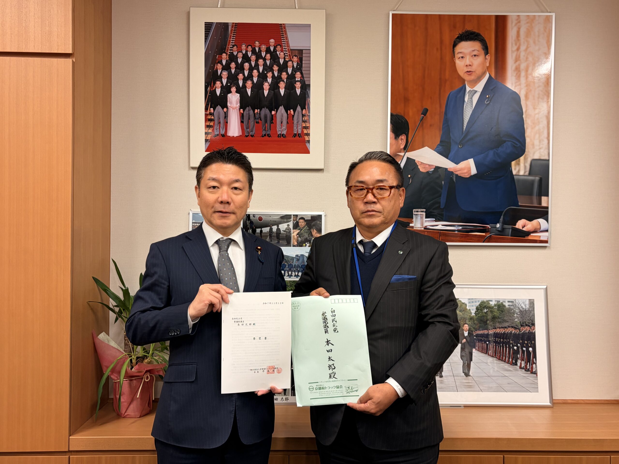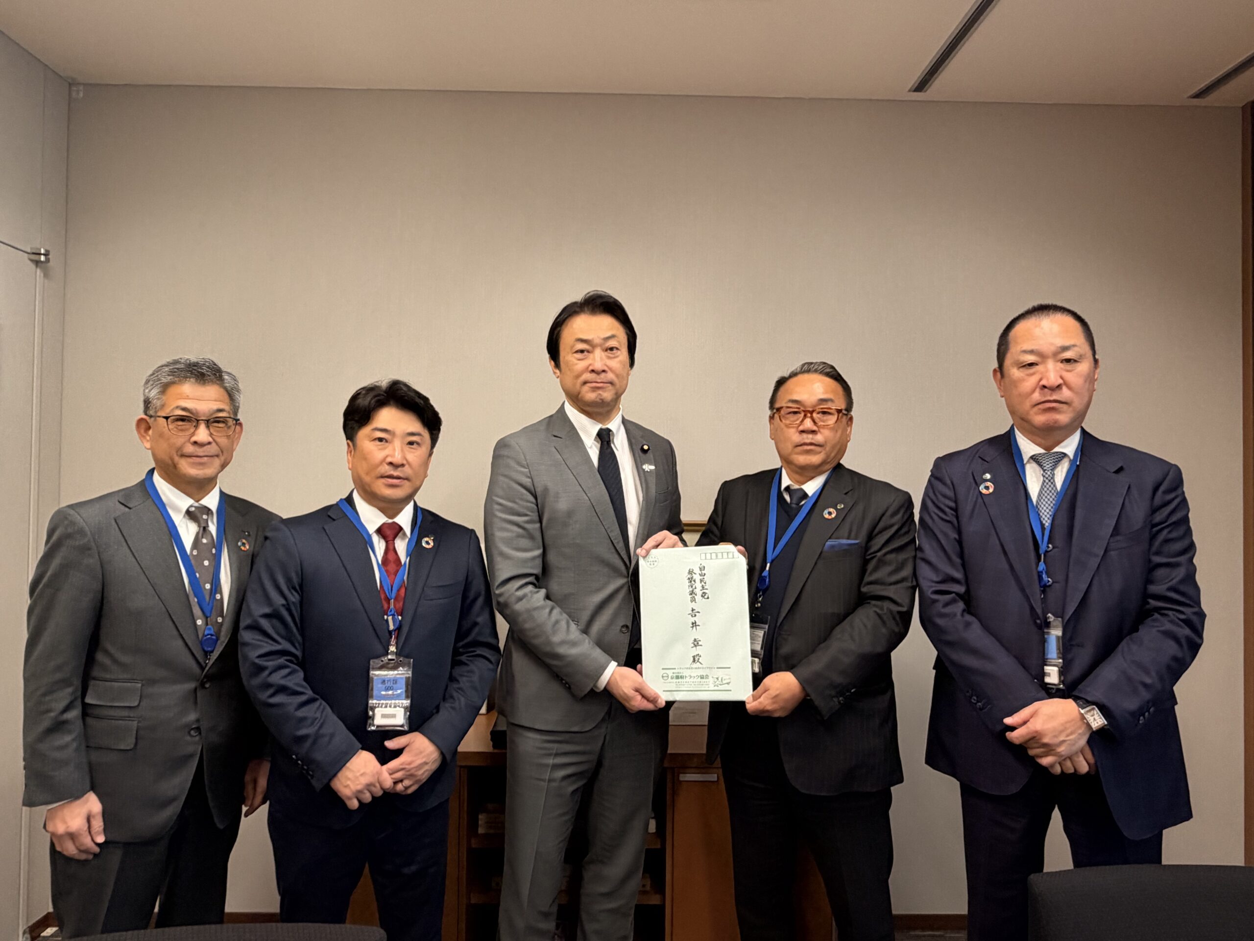 令和7年11月12日、平島会長、宮本副会長、村尾副会長が、衆・参議員会館を訪問、自民党選出議員に対し業界の要望事項「貨物集配中の車両に係る駐車規制見直し」、「Gマーク制度の普及・認定事業所の利用促進」、「軽油引取税の暫定税率廃止」、「運輸事業振興助成交付金の継続」等を含めた、政策実現に向け申し入れを行いました。