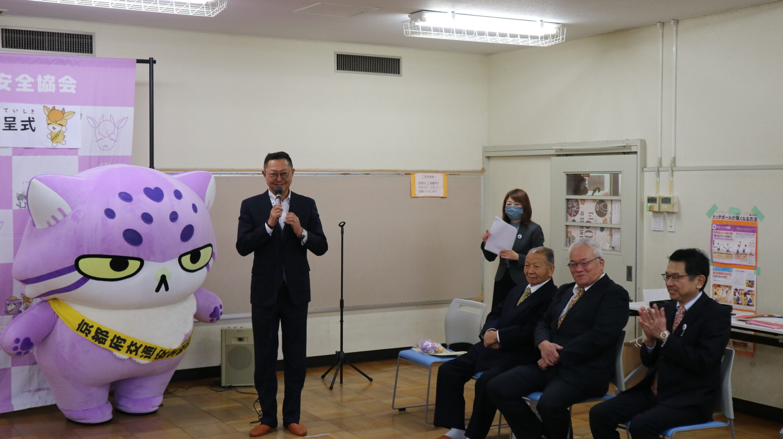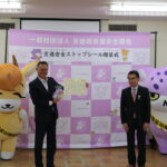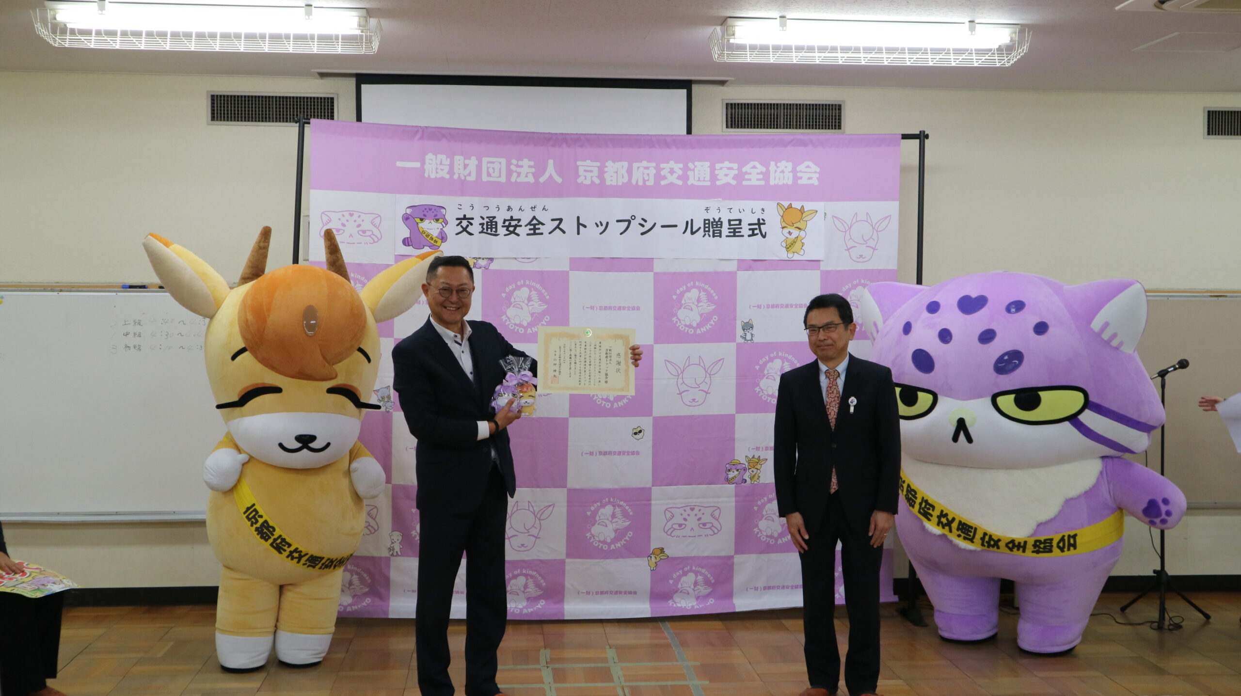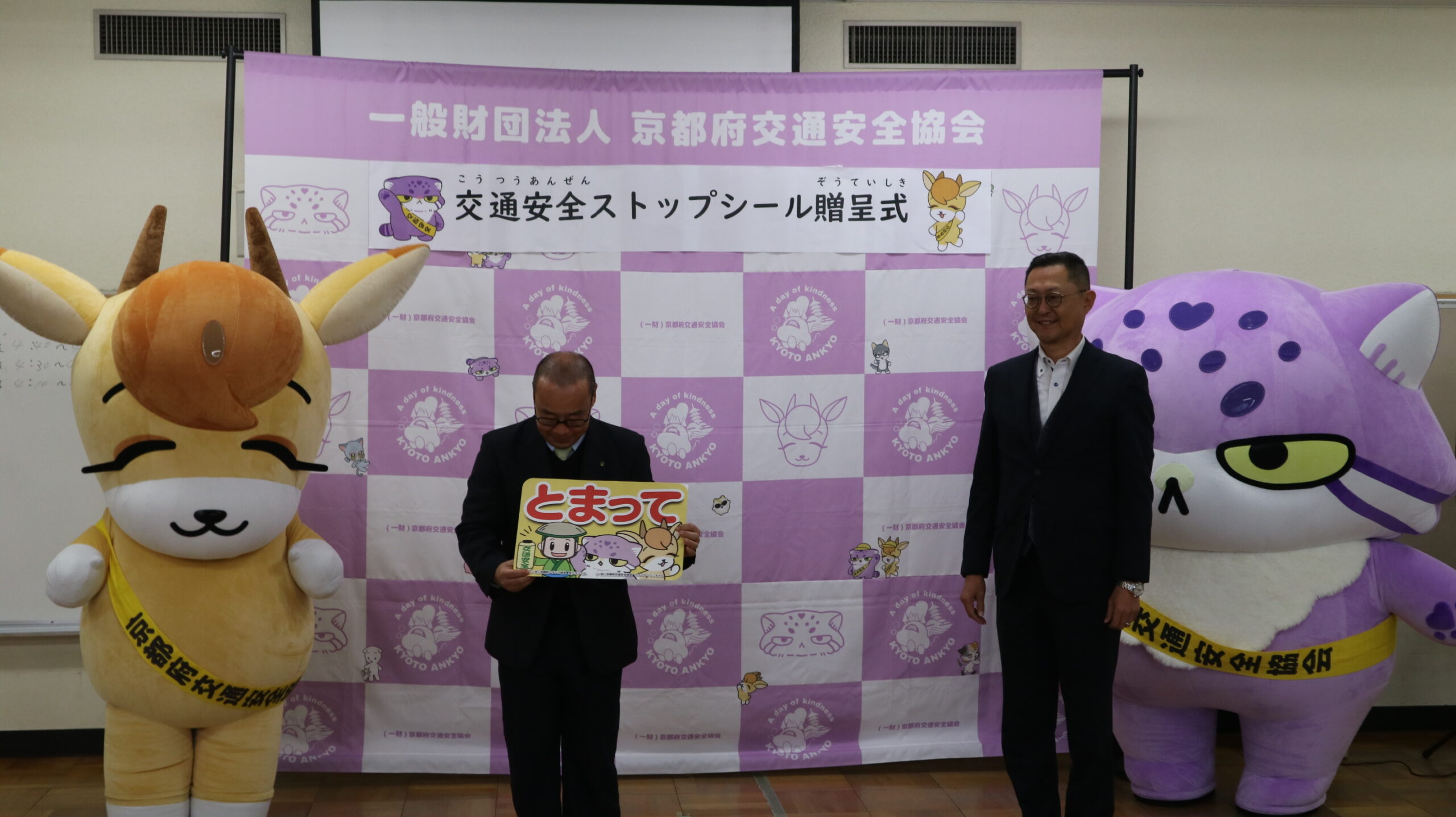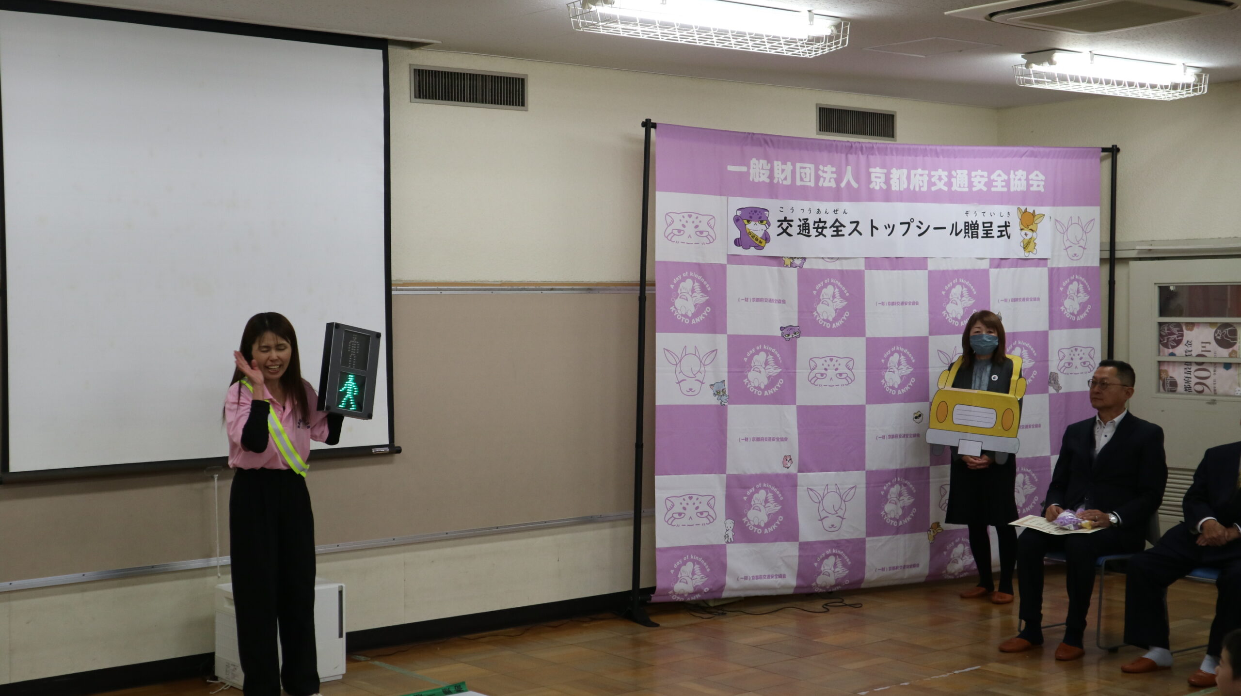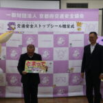 山本副委員長から、児童館前の歩道等への飛び出し防止を啓発するストップシール250枚(京都府内の全児童館分)を贈呈しました。