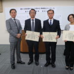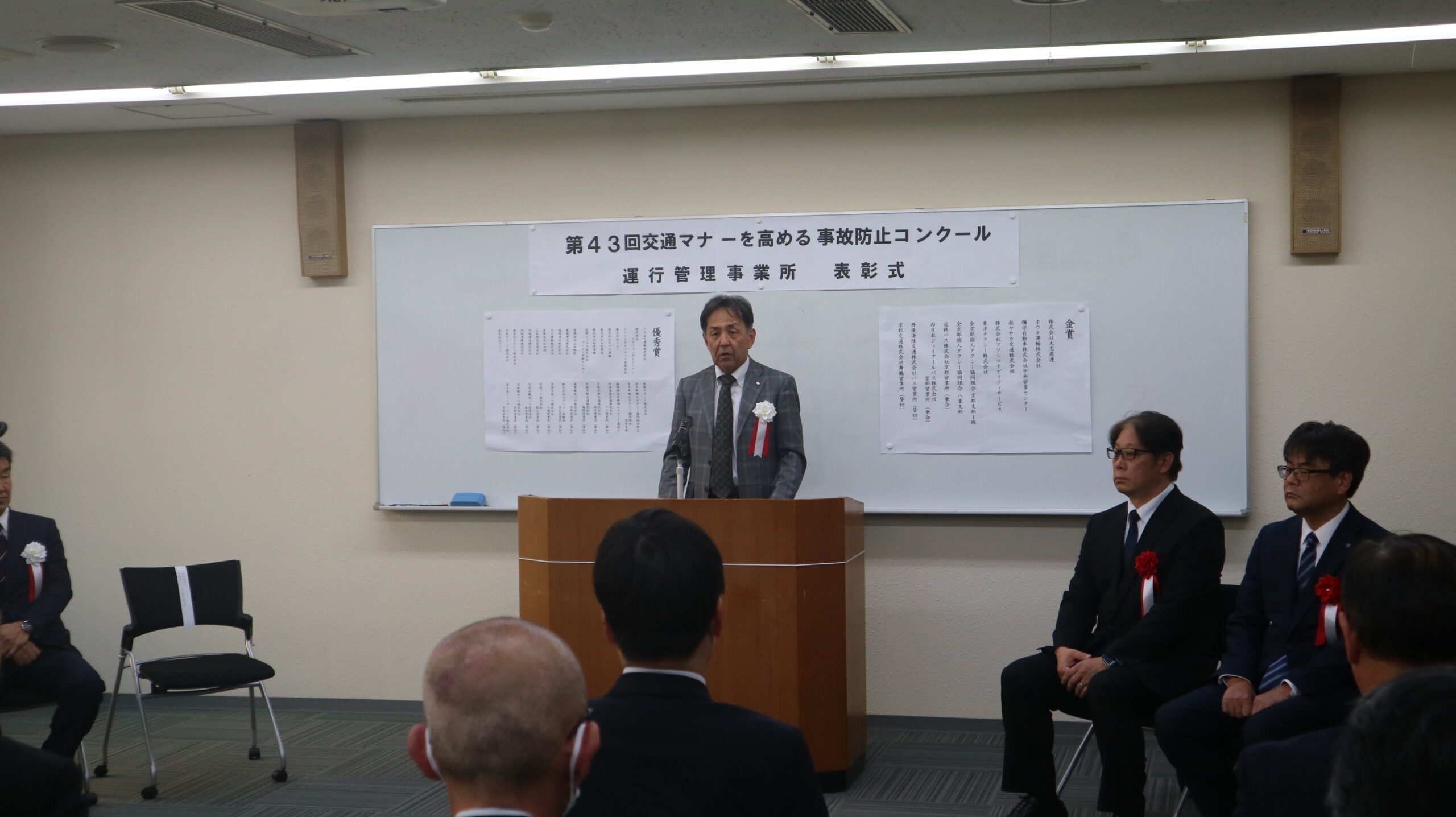 「本コンクールは、昭和57年に道路交通の安全確保を図ることを目的にスタートし、地域社会の交通モラルの確立と交通安全の啓発に貢献してきた。入賞者におかれては、引き続き、安全運転や交通マナーの向上を心がけていただくとともに、アイドリングストップやエコドライブ、ゴミのポイ捨て禁止等にも取り組んでいただきたい。」と主催者を代表し蒔田副会長が挨拶。金賞・優秀賞・奨励賞の表彰が行われ、京都府トラック協会からは以下の3会員が代表事業所として受賞された。