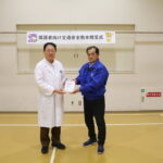 令和7年度の安全通学支援事業の一環として、小寺委員長から長村センター長に保護者向け交通安全教本700冊を贈呈しました。